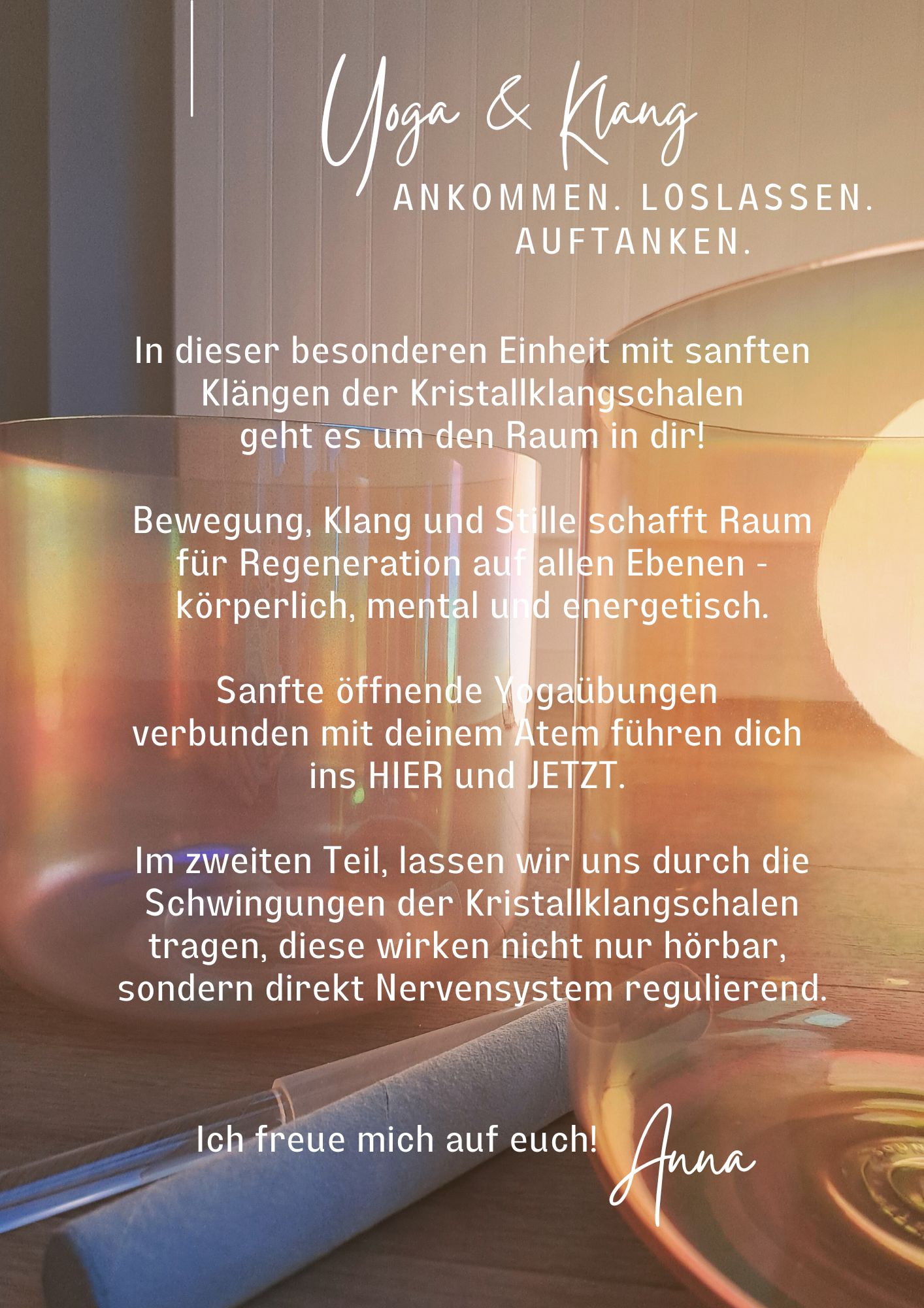 Im zweiten Teil, lassen wir uns durch die Schwingungen der Kristallklangschalen tragen, diese wirken nicht nur hörbar, sondern direkt Nervensystem regulierend.
